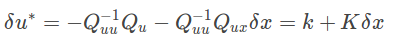 \delta u^* = -Q_{uu}^{-1} Q_u -Q_{uu}^{-1} Q_{ux} \delta x = k + K \delta x