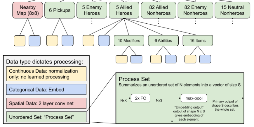 Process Set 实际是一个一维卷积加全局池化的过程。这样处理的原因是这些数据是 unordered 的。例如有固定数量的 5 个敌人,每个敌人用长度为 n 的向量表示。如何将这 5 个敌人的信息输入到神经网络中?如果拼接得到长度为 5xn 的向量,这是不对的。因为无法进行排序。而一维卷积加全局池化的运算在一个维度上是与顺序无关的。
