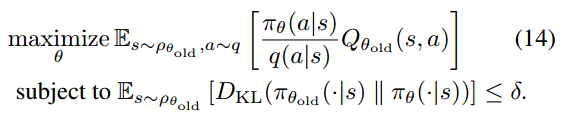 在 TRPO 算法中,使用 KL 约束,即约束前后两个策略的更新距离: