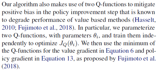 我们的算法同样在策略更新步骤中使用了两个 Q 函数来消除 正向偏差,众所周知,这样会降低基于值方法的性能(但是更稳定,译者补充)。特别的,我们使用两个 Q 函数网络的参数,独立地更新它们来优化函数 JQ,在进行值梯度和策略覆梯度计算时,使用这两个 Q 值的最小值。