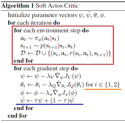 在上面算法中,对 Q 的参数更新时,i 可取值 1 和 2(橙色下划线),这是因为使用了两个 Q 函数网络。